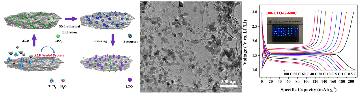 该研究成果首次报道了关于利用原子层沉积育种技术制备钛酸锂/石墨烯复合电极材料的研究,并利用第一性原理从理论上进行了计算分析。该材料独特的微观结构使其充电25秒即可实现70%的理论容量(即100 C电流密度时的放电容量高达120.8 mAh/g)。此项技术为制备新型石墨烯复合电极材料开辟了新思路,以该复合材料为负极的锂离子混合电容器的功率密度甚至超越了双电层型超级电容器,具有重要的研究意义和实际应用价值。《Nano Energy》最新(2016年)影响因子为11.553,5年影响因子为12.272,是材料科学、纳米能源领域的著名期刊。