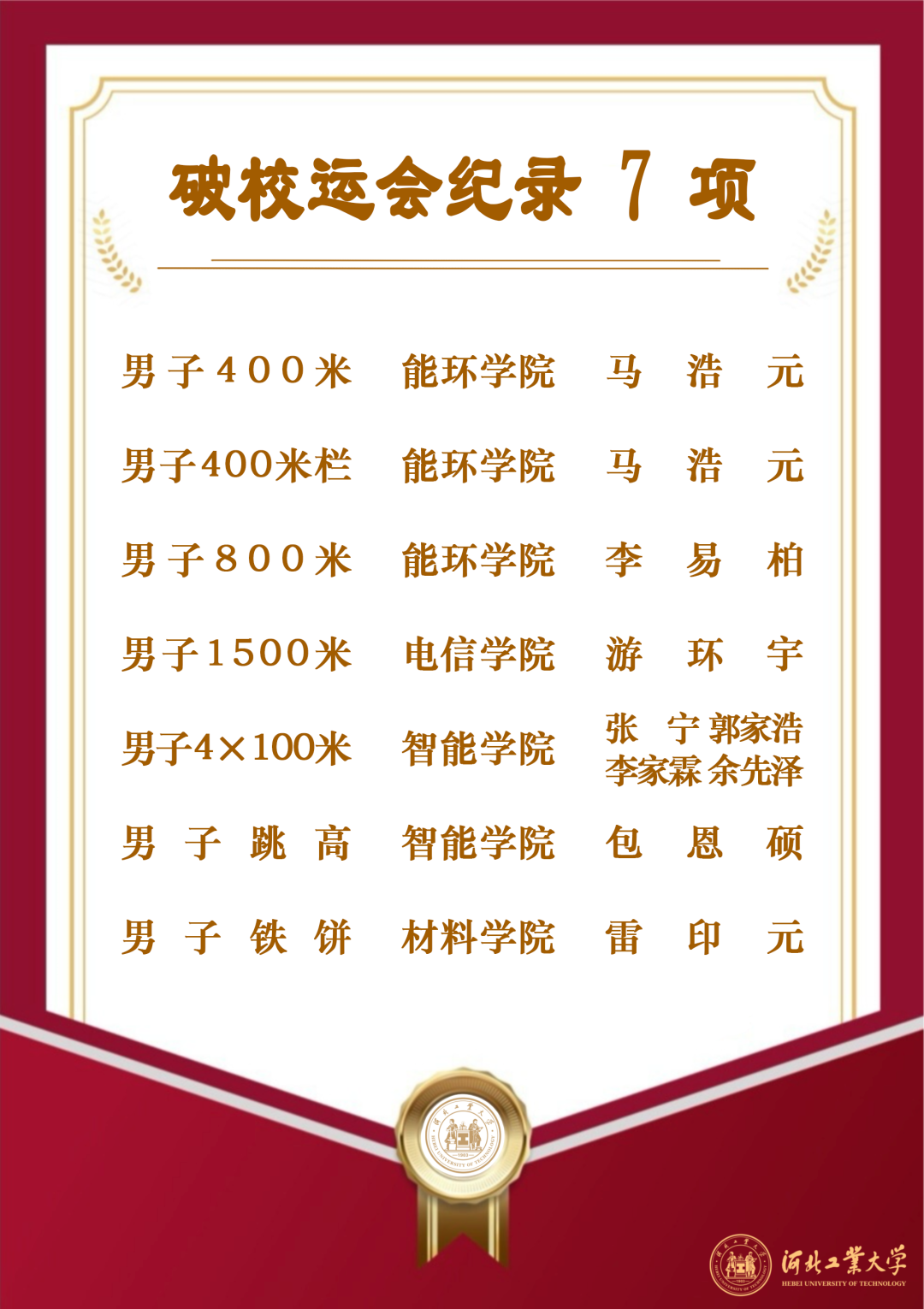 总裁判长乔立波宣布破纪录情况和团体总分成绩。本次校运会中共5人(队)7次破7项校运会记录: