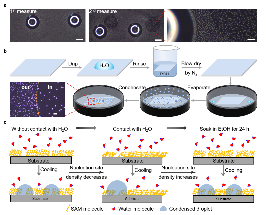 故事开始于大约七年前的一天,当时的白国英还是博士研究生,在做冰成核温度的测量(一个通过光学显微镜观察表面上水滴在降温过程中冻结过程的实验,如有兴趣,请参阅“Nature 2019, 576,437-441”了解更多细节)时,发现再次测量之前测试过冰成核温度的表面时,上一次测试中的水滴痕迹以一种独特的冷凝水滴图案显示出来(图a)。白国英说道,“虽然该现象看起来很有趣,但因为当时的博士课题就将其暂且搁置了,直到2020年,我的学生再次观察到这一现象,我才把它捡起来,进行了系统的研究”。
