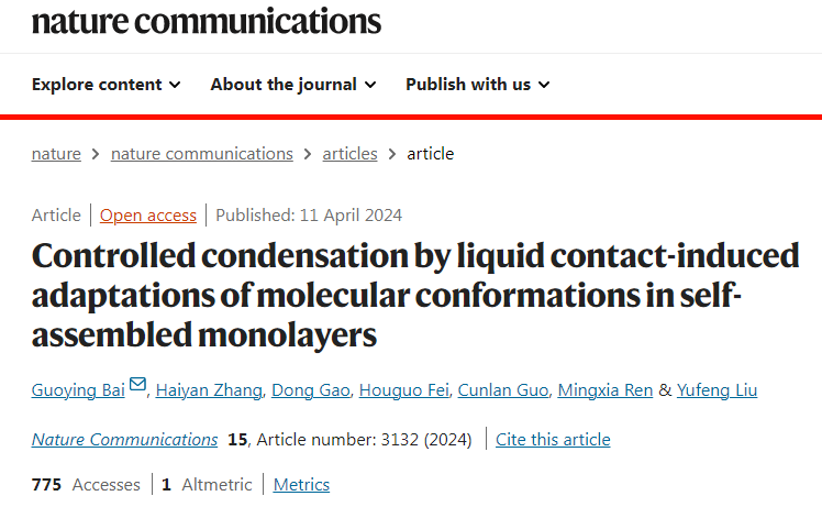 4月11日,河北千亿qy88国际官网入口材料学院白国英教授课题组在Nature Communications上发表题为“Controlled condensation by liquid contact-induced adaptations of molecular conformations in self-assembled monolayers”的高水平论文,并被刊登在Nature Communications编辑精选网页(展示某一领域最近发表的50篇最好论文)上。河北千亿qy88国际官网入口材料科学与工程学院天津市层状复合与界面控制技术重点实验室为第一完成单位。