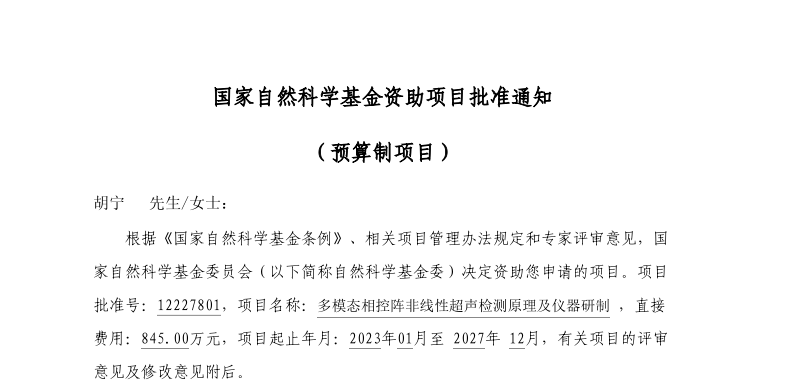 近日,由我校胡宁教授主持申报的国家重大科研仪器研制项目“多模态相控阵非线性超声检测原理及仪器研制”获得国家自然科学基金委员会批准立项(批准号:12227801),项目直接经费845万元。这是我校今年获批的又一项重大科研项目,也是学校近年来第二次获批重大仪器项目,展现了我校在高端仪器研制方面的巨大潜力,也是我校在新一轮国家“双一流”建设进程中的一项标志性成果。