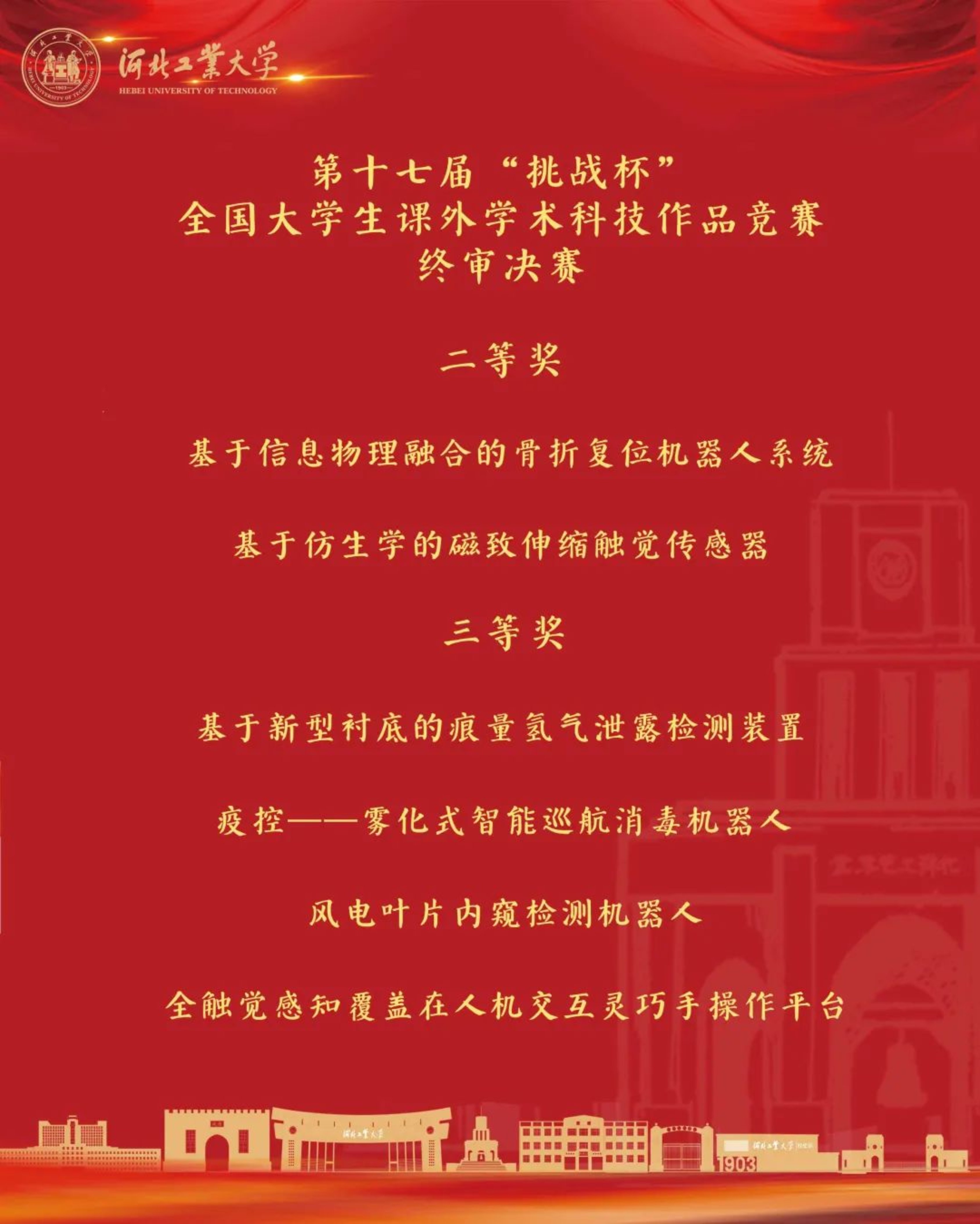 共青团中央、中国科协、教育部、中国社科院、全国学联和四川省人民政府主办、四川大学承办的第十七届“挑战杯”工商银行全国大学生课外学术科技作品竞赛落下帷幕。我校所推报6项作品全部获奖,其中国赛二等奖2项,三等奖4项,总分160分,位列河北省第一,是我校在“挑战杯”国赛中获得的最佳成绩。此外,红色专项赛我校获得全国二等奖1项;翁玲老师获得国赛“优秀指导教师”称号。